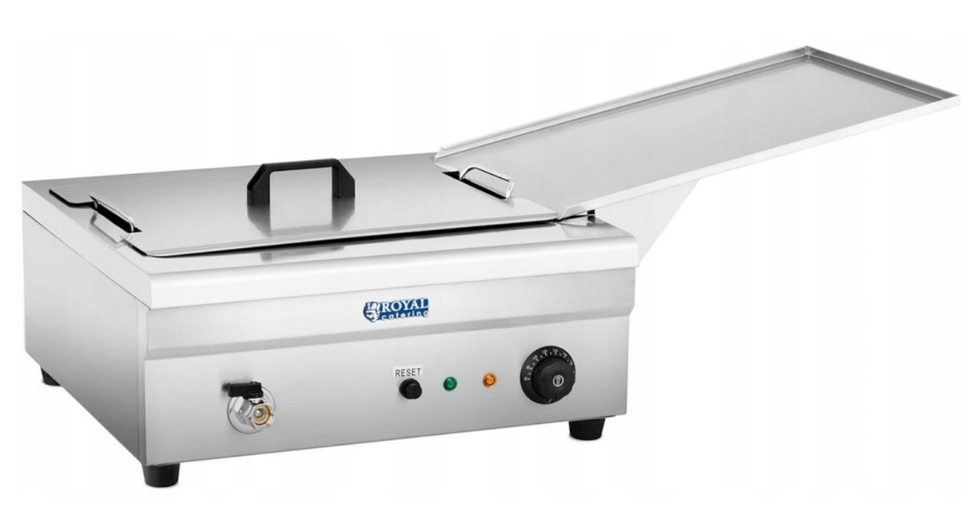 Wydajny smażalnik do pączków, faworków, nuggetsów i innych potraw smażonych na głębokim tłuszczu został zaprojektowany do intensywnego użytku w gastronomii. Urządzenie sprawdzi się w piekarniach, pączkarniach, food truckach oraz innych tego typu lokalach. Marka Royal Catering zadbała o jak największą funkcjonalność oferowanego produktu.