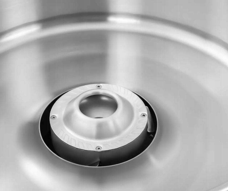 Misa o średnicy 52 cm umożliwia zrobienie przekąski w różnych wielkościach. Do wykonania naczynia i łyżki (gratis w zestawie) zastosowano stal nierdzewną, podobnie jak do całej reszty wytrzymałej konstrukcji. Akcesoria nadają się do mycia w zmywarkach. Cztery klamry zabezpieczają naczynie i redukują wibracje.