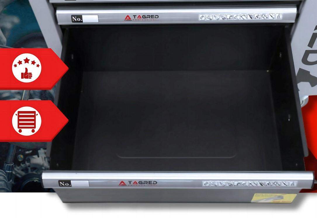 Pozwala utrzymać porządek na stanowisku pracy, a także chroni narzędzia przed kradzieżą (wózek zamykany na kluczyk). Wózek posiada ergonomiczne uchwyty zintegrowane z blatem, w pełni wysuwane szuflady na łożyskach. Centralny zamek z dwoma kluczami zamykający wszystkie szuflady oraz podwójne ścianki i blokadę szuflad. Wózek wyposażony został w 4 kółka co bardzo ułatwia transport. Dodatkowo posiada narożniki odbojniki (chronią przed przypadkowym uszkodzeniem np. karoserii samochodu).