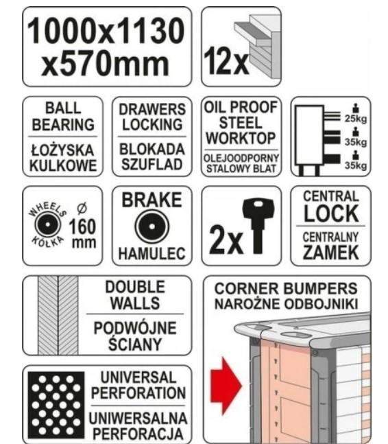 Posiada 12 szuflad na prowadnicach kulkowych w wytrzymałości nacisku do 25 kg (3 szuflady górne) i do 35 kg (szuflady dolne)