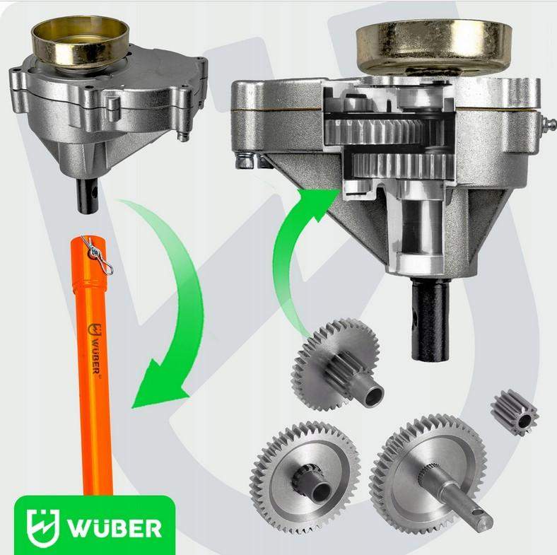 Przełożenie mocy silnika na wiertło następuje za pomocą wzmacnianej przekładni wykorzystującej metalowe koła zębate